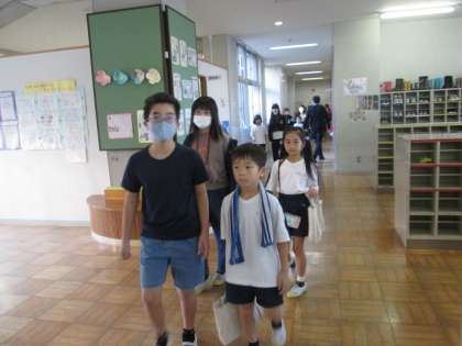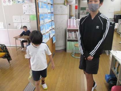 今日はペア読書の日です。低学年の子たちは高学年に手を引かれ、教室を移動していました。どんな本を読んでくれるのかな。楽しみですね。