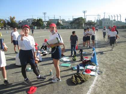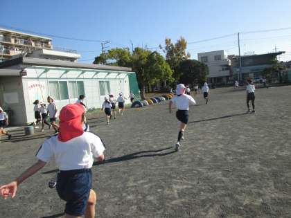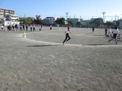 4年1組は持久走です。吐くも白く、ほほを赤らめながら一生懸命走っています。