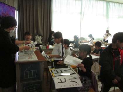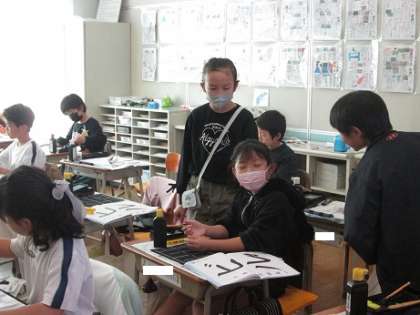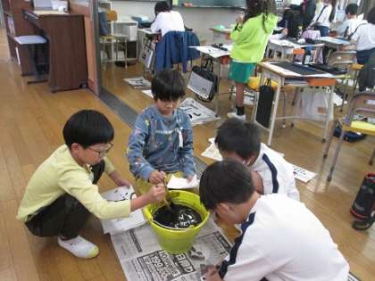 3年生は書写の時間において毛筆を行いました。曲がりとおれに気をつけながら「ビル」という字を視写しました。活動を終えた後は、バケツを使ってみんなで筆を洗っていました。