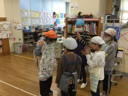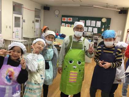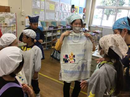 仲よし学級の学習の様子です。家庭科ではエプロン制作を行いました。学級担任用のエプロンをみんなで作り、プレゼントしました。