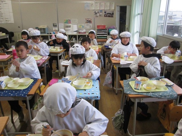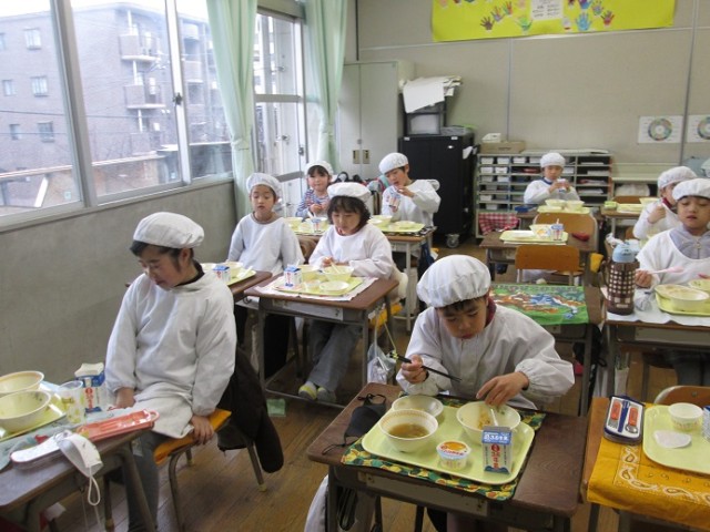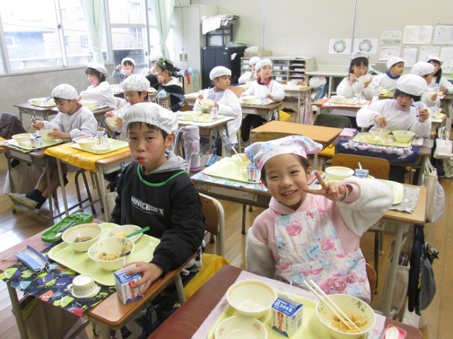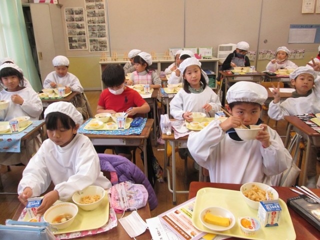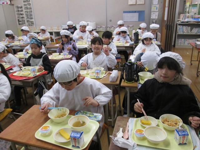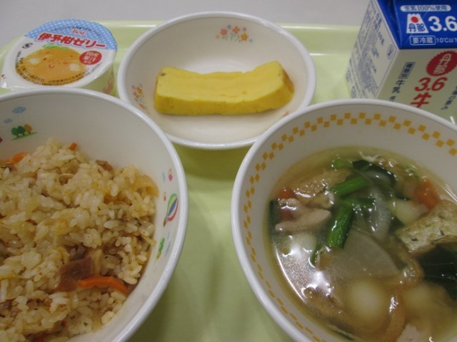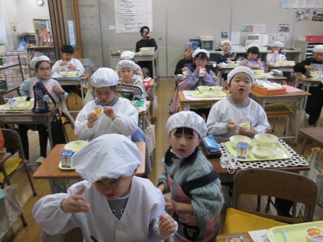 今日の献立は、キムタクご飯、厚焼き卵、白玉汁、ゼリー、牛乳です。「キムタクご飯」とはどこで開発された給食メニューか覚えていますか?キムチは「なんにも辛くない!」と言う子と、「ちょっぴり辛い」と言う子がいました。白玉をお箸に3つ刺している子もいましたよ。