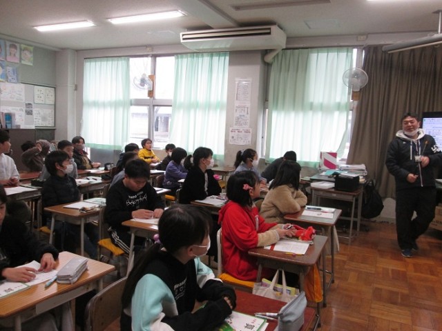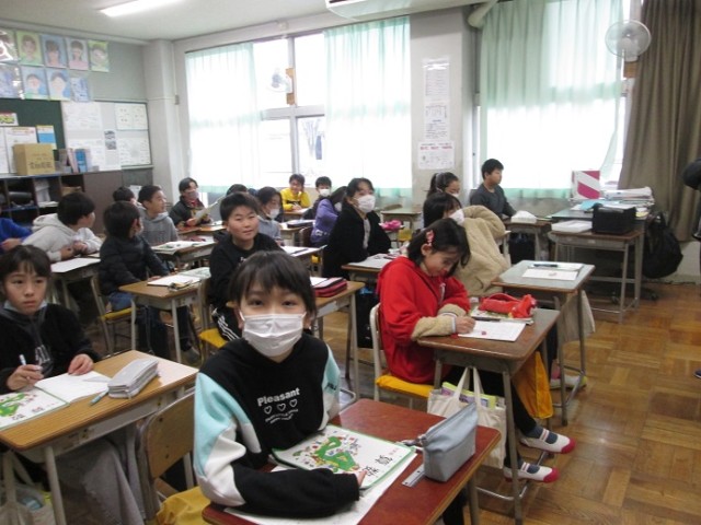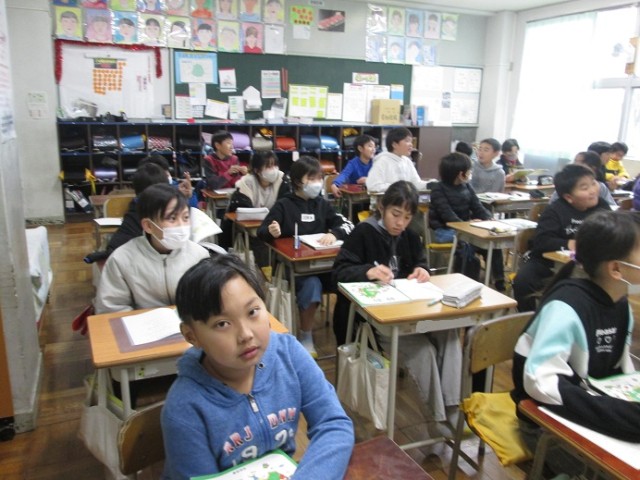 4年4組は算数の立体の学習です。「明日は先生が描いたこの図を描く練習をしましょう」「え~。難しそう」「コツさえつかめば大丈夫。では明日は、リリーと盛山の学習をします」と先生からのジョーク。「リリーと盛山って何?」とみんな。明日の学習が楽しみですね。
