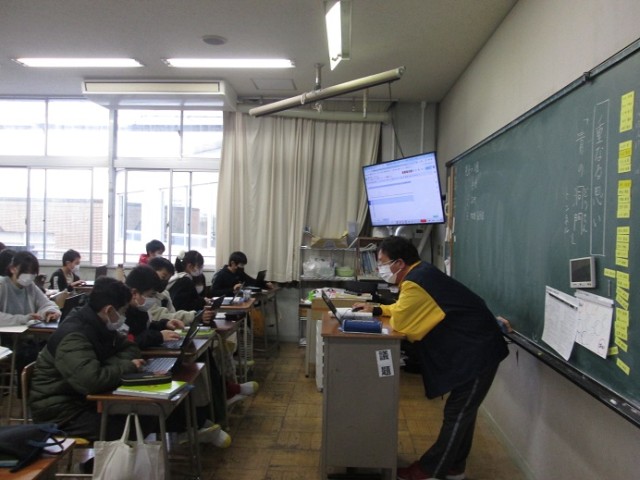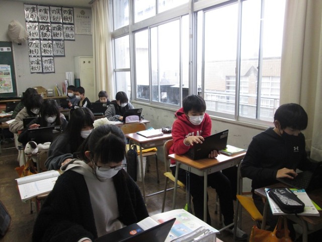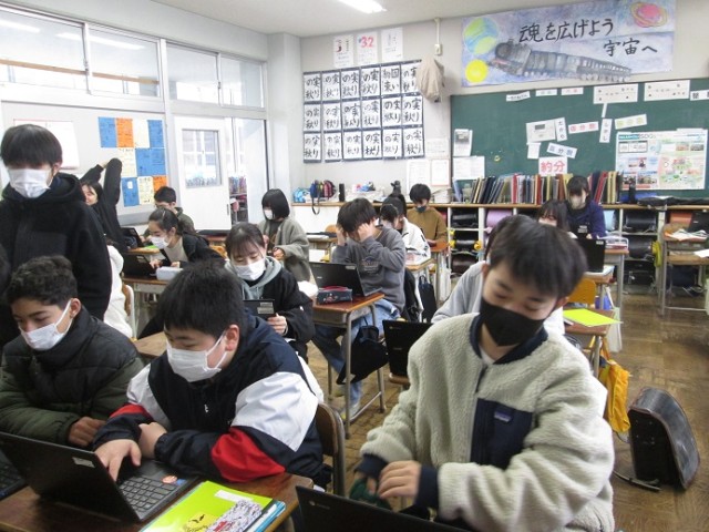 6年3組は、算数「資料と代表する値」の学習をしています。Chromebookを使ってたくさんの数を処理しています。「大変だ・・・」という声も聞こえてきますが、粘り強く処理しています。合計、平均、中央値、最頻値などを求めています。