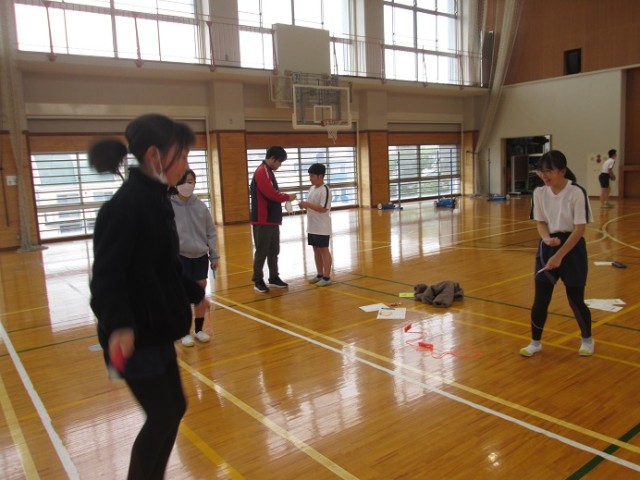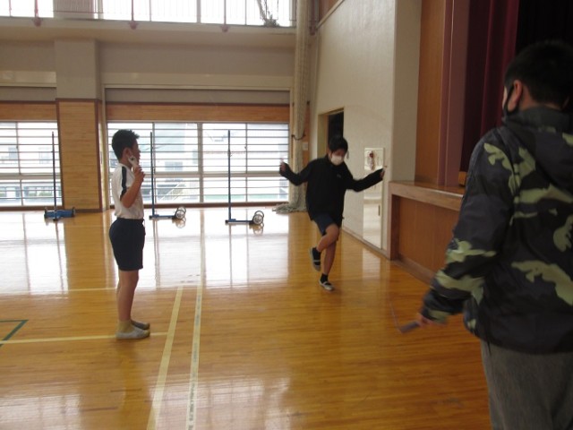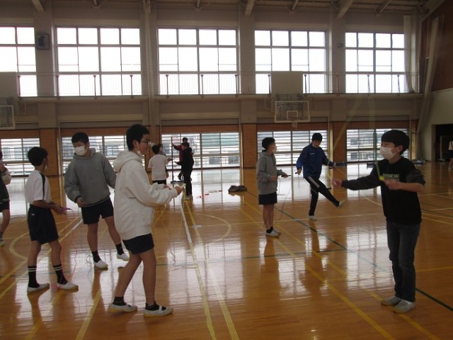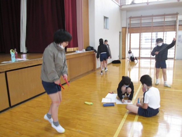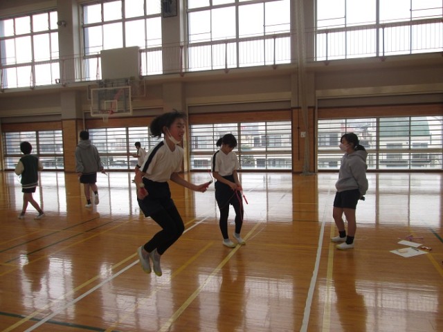 6年1組は体育です。縄跳びに取り組んでいます。6年生で縄跳びカードが進んでいる子は、特級C級(65種合格)か、特休B級(75種合格)の子もいるとか。気持ちよさそうに、冷たい風をピュンピュンと切りながら跳んでいます。跳び終えると、床にバタンと倒れ込みそうになるほど体力も使っていました。この後はソフトバレーボールです。