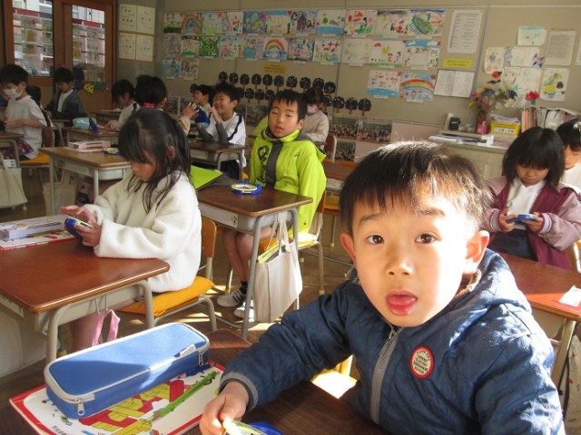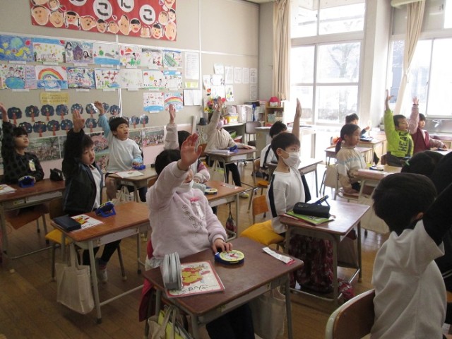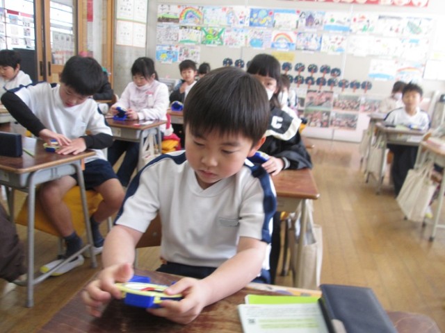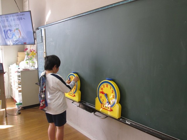 1年1組は算数で時計の学習をしていました。先生が「9時に合わせてください」など、問題を出します。みんなは小さい時計で時刻を合わせます。すばやく合わせられるようになりました。