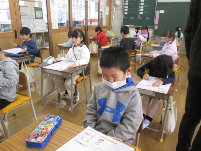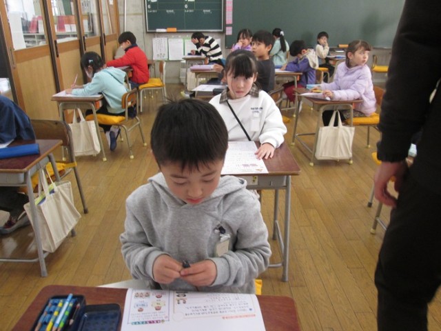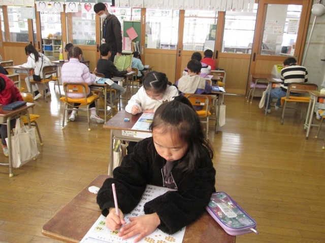 1年2組は、算数「20より大きな数」のテストです。「よし。できてる」と小さな声が聞こえました。見直しをしているつぶやきです。テストの時には、しっかりと見直しをする習慣も身についてきました。