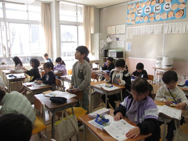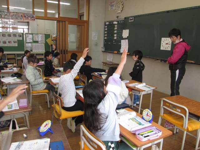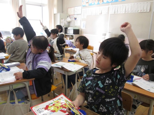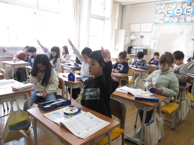 1年4組は算数で時計の学習です。先生が時計に示した時刻を、答えています。みんな、積極的に発表しています。長い針と短い針の読み方の違いに気づいています。