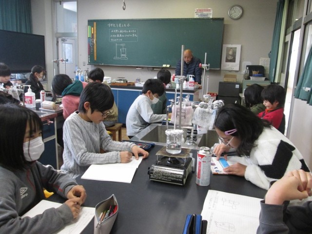 4年3組は理科「水のあたたまり方」の学習です。水を温める実験を通して気づいたことをまとめていきます。安全なガスコンロの使い方はできますか。実験はまずは安全第一で行ってくださいね。