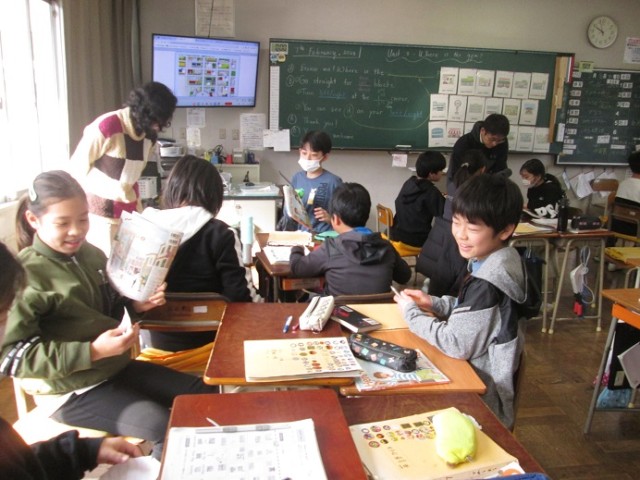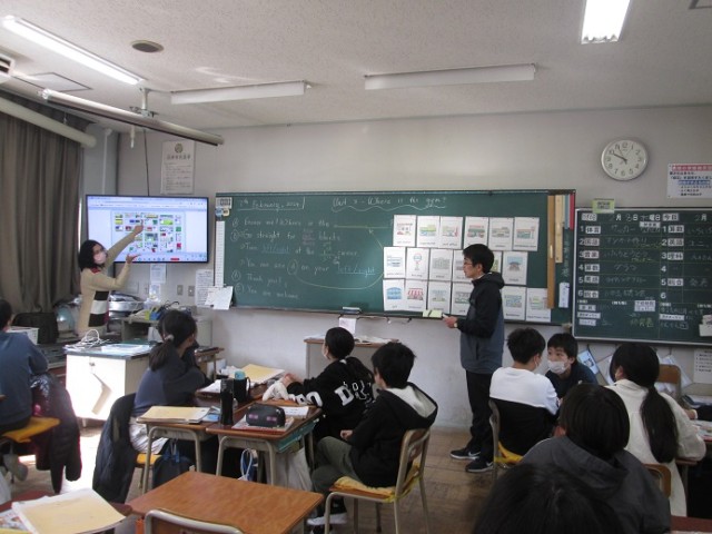 5年1組は英語「Where is the gym?」の学習です。地図上で自分の行きたい場所を伝え、英語で道案内をするという学習です。上手に伝えて、目的地にたどり着くことができたかな?