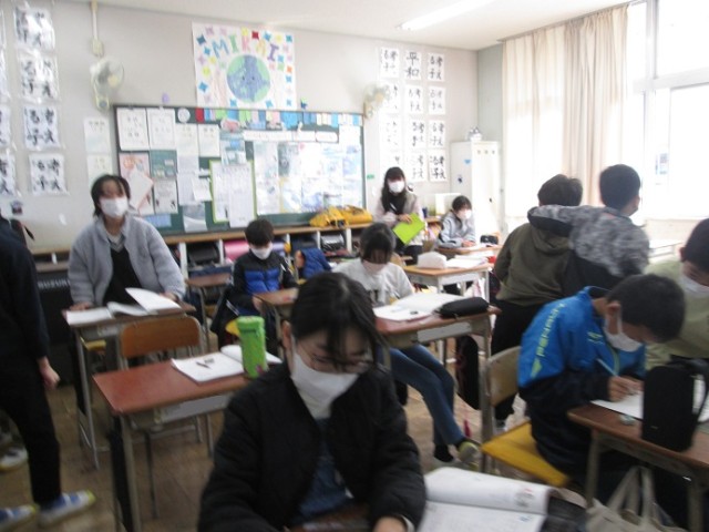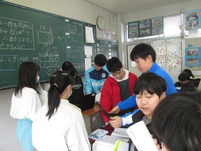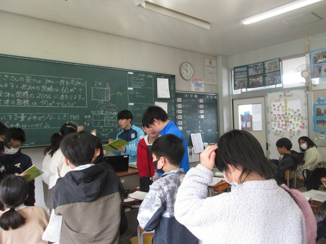 5年2組は算数「割合」の学習です。畑全体の20%を花畑にしようとしている。その花畑の面積を求めるという問題に取り組んでいました。できた子達は先生に確認してもらっています。また、友達と教え合いもしています。
