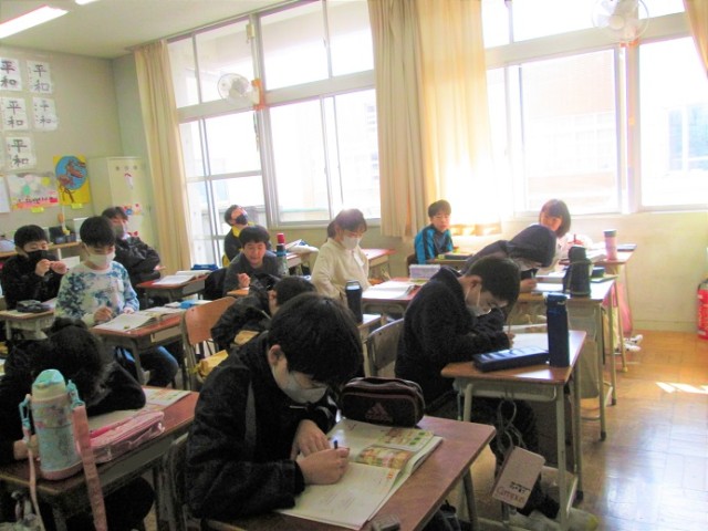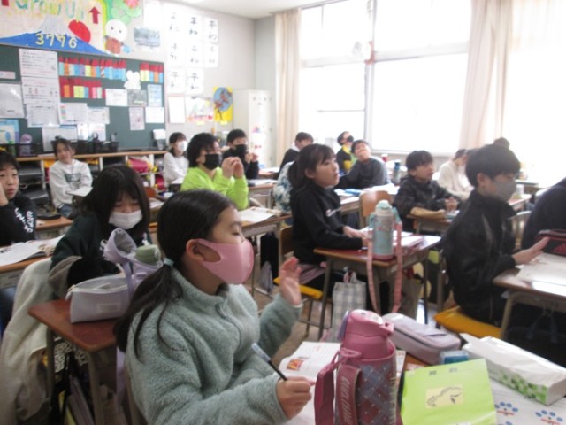 5年4組は、算数「割合」の学習です。「どちらがどれだけ安いか」、「男子と女子の割合と人数」など、生活の中でもいろいろなところで目にしたり、耳にしたりする問題が多く出されています。