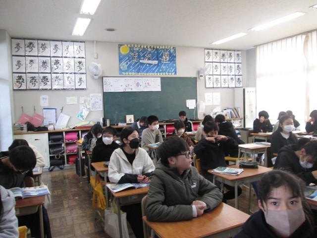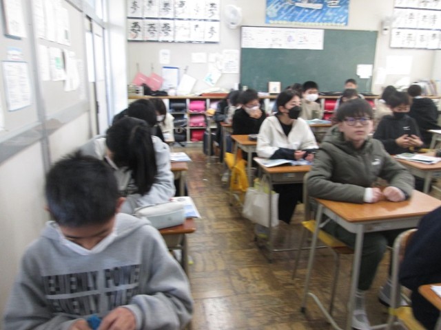 6年2組は理科「生物と地球環境」の学習です。緑が増える、川がきれいになっている、いろいろな生物が住めるようになるなどの意見が出されていました。生物多様性についても学んでいます。