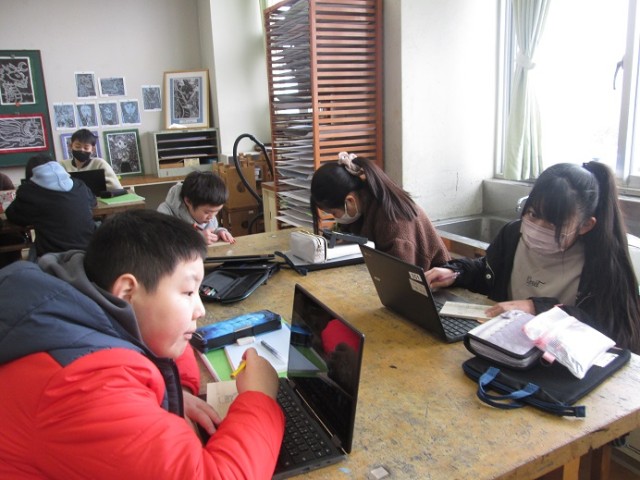 6年4組は図工「卒業制作」です。板が小さいのでなかなか彫刻刀を使いづらそうですが、「思い出を形に」を目指して頑張っています。寒いので彫刻刀でけがをしないように進めてくださいね。