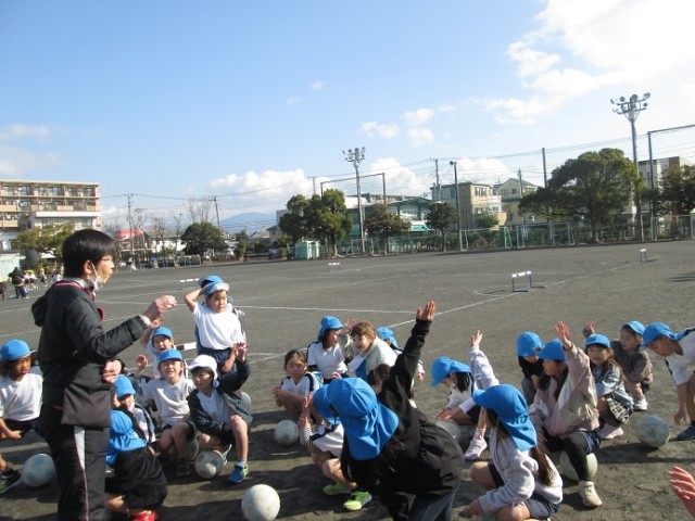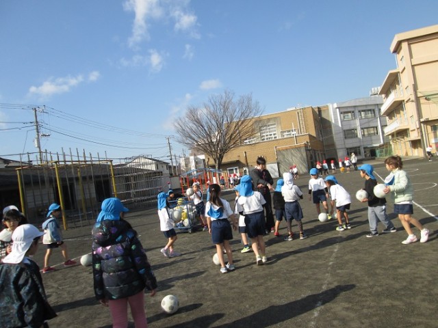 1年4組は体育「ボール蹴り運動」です。サッカーボールが上手に扱えたかな?ドリブルなどにチャレンジしていきましょう。