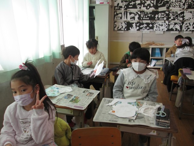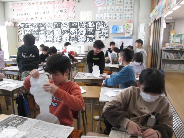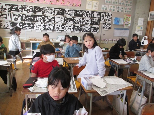 2年1組は図工「紙版画」です。目や口、鼻など配置しています。とってもユニークな作品になりそうです。楽しみながら手を動かして活動しています。早く刷りたいですね!