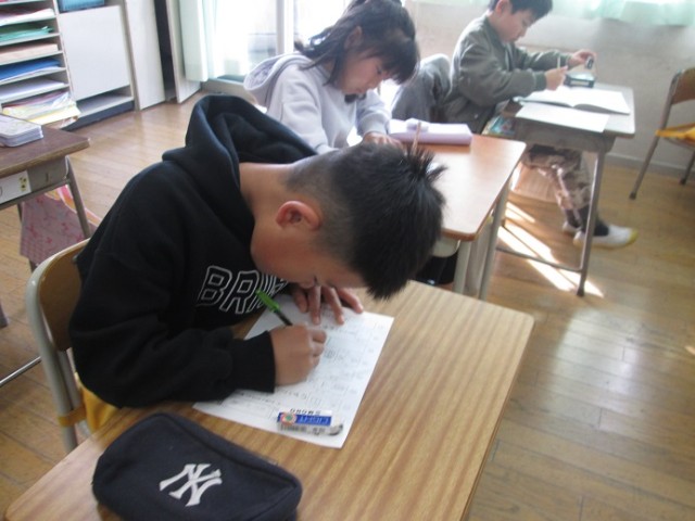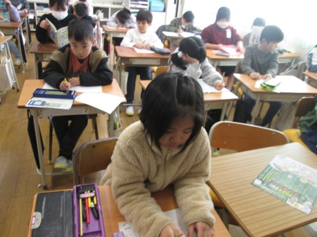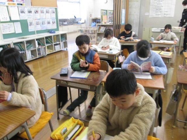 2年2組は国語の受業の前に漢字テストです。終わった子は提出し、静かに読書をして待っています。みんな、真剣に、集中して取り組んでいます。
