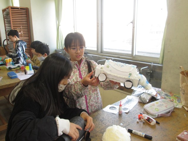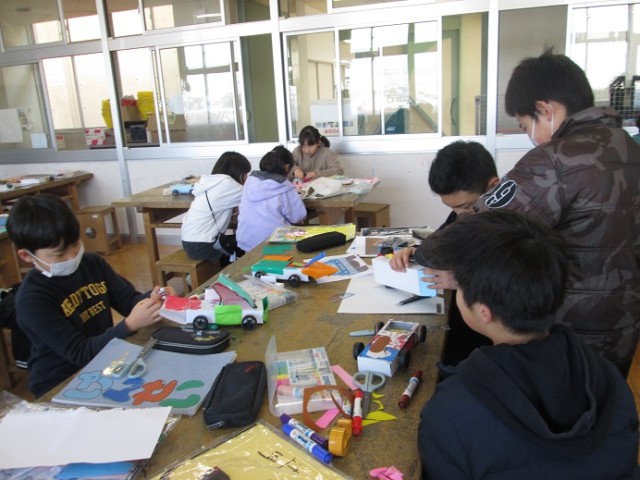 4年2組は、図工「ゴーゴー!ドリームカー」の学習です。Chromebookで車のデザインを見ながら、フロントウイングを作る子、かわいらしいしっぽを付けたり、飾りを付けたりして作る子などなど、創造が膨らみます。