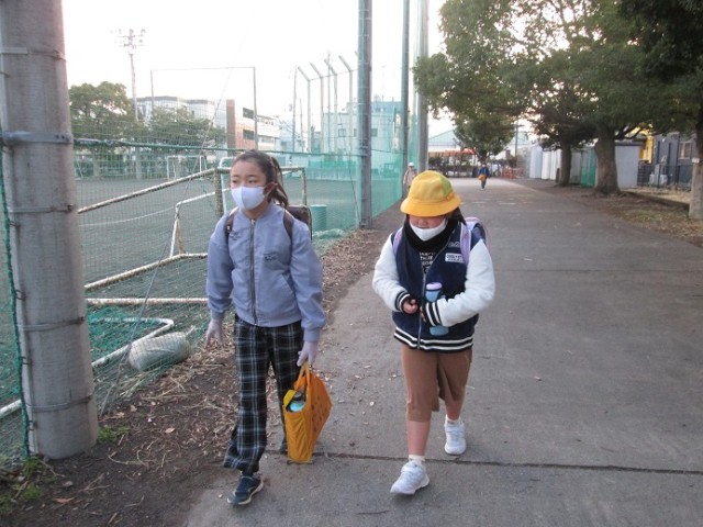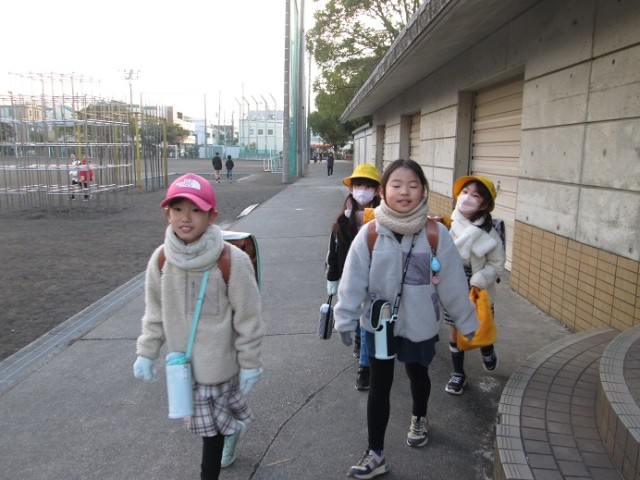 2/9(金)、晴天の朝です。東門から登校する子達は朝日に背中を押されながら元気よく登校しています。