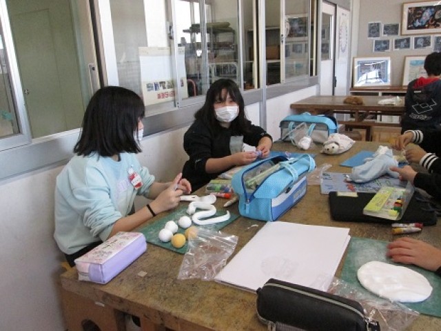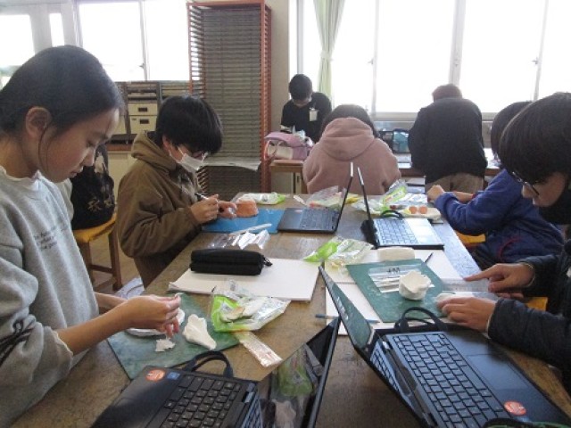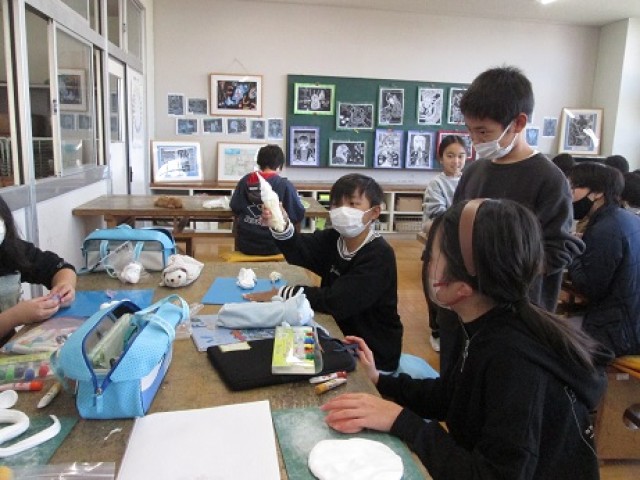 5年生は図工で「紙粘土を使ったわくわく商品ディスプレイ」という題材を学習しています。それぞれが自分のお気に入りの食べ物を紙粘土で製作しました。ソフトクリームやハンバーガー、三色だんご、おそば等、みんなで思い思いにつくっています。