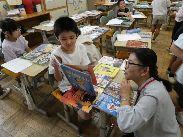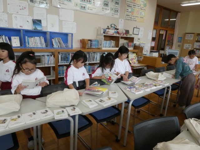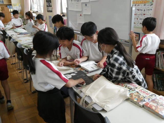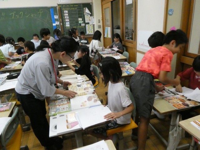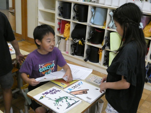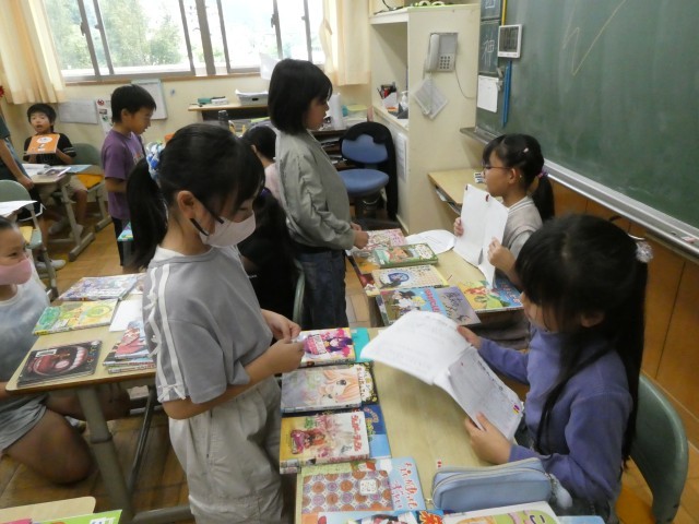 「読書の秋を楽しもう」ということで、約3週間で読んだ本を机の上に並べて、本屋さんを開店しました。お客さんが来たらおすすめの本の魅力をお話しします。「読んでみたい!」と思ったら、シールを貼ってお買い上げです。