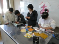 ミシンでソーイングの学習に入りました。まずは、教科書やワークを使ってミシンのパーツの名前を覚えたり、使い方をイメージしたりしました。この後、実際にミシンを触って確かめてみました。