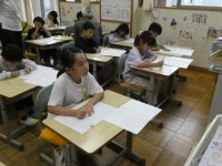 熱中症の心配があるので、エアコンの効いた教室で体育の授業をしました。