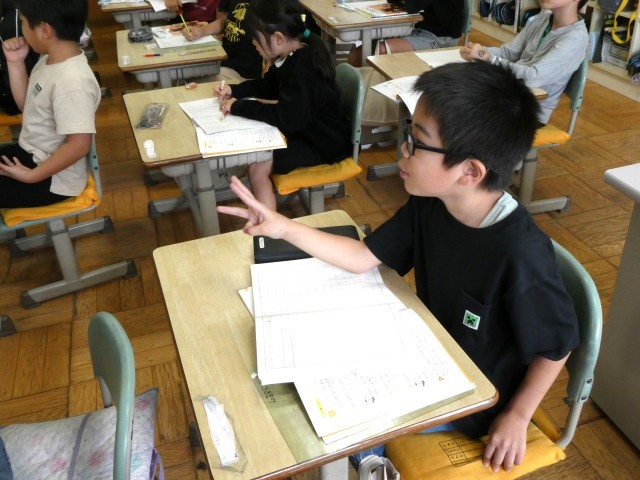 かけ算の学習をしています。〇倍という言い方を学びました。〇倍ってどういうことだろう? その数がいくつあるかってことだよ。上手に説明している子、しっかり聞いている子、深い学びへの入り口です。