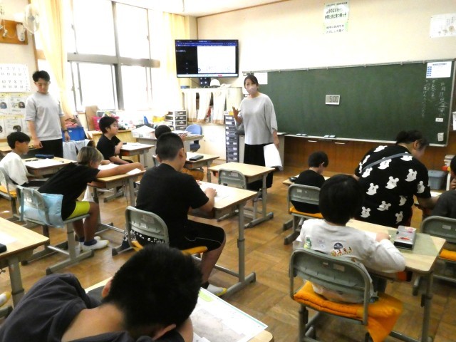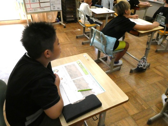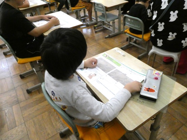 鳥獣戯画を見て、動物たちが何をお話ししているのか想像します。先生が「これは日本で一番古い漫画です。」と言いました。台詞は、自分たちの頭の中で・・・。