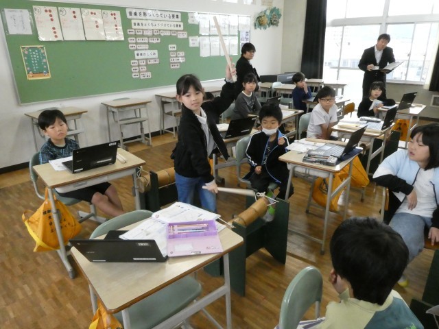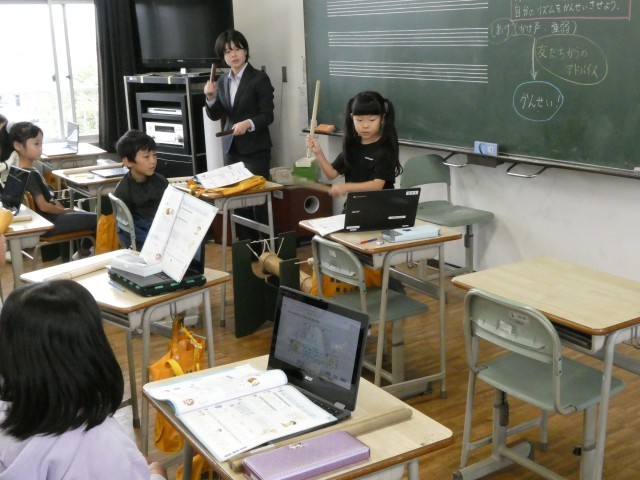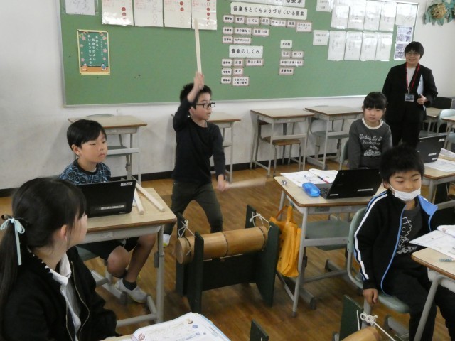 繰り返しを生かしてお祭りの太鼓のリズムを考えました。どんな感じにしたいのか、そのイメージが表現できたか、友達に聞いてもらいました。