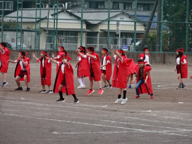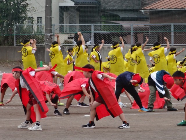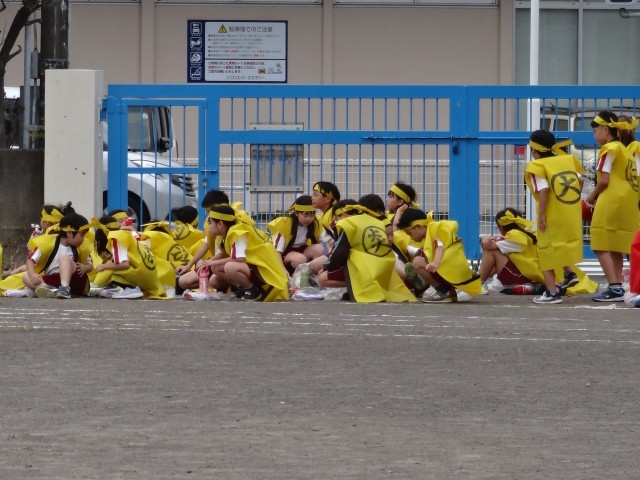 3年生は、黄色。4年生は、赤色のはっぴを着て練習です。
