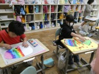 2年生は、どのクラスでも「動くおもちゃ」を作成中。風の力、ゴムの力などで動くおもちゃを作って楽しんでいます。来年から始まる理科の学習にも繋がります。