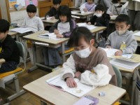 ふくわらいを楽しみました。up,downなど、方向を表す言葉を使って、目隠ししている友達をガイドします。