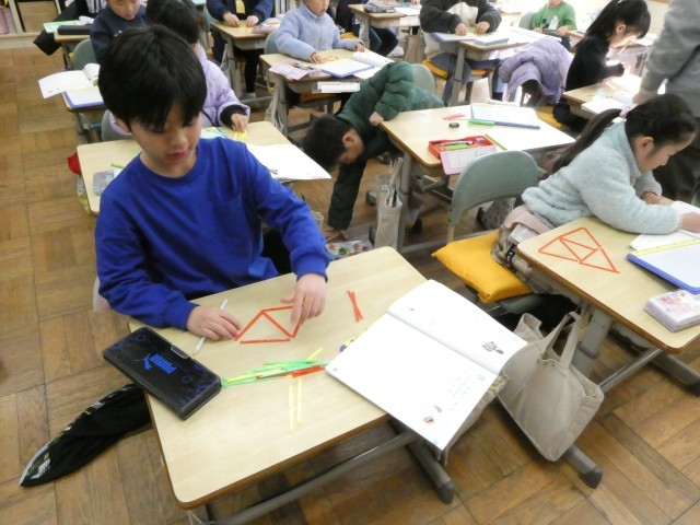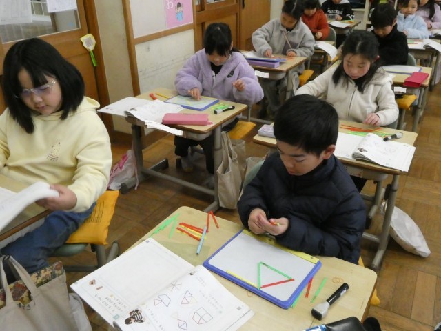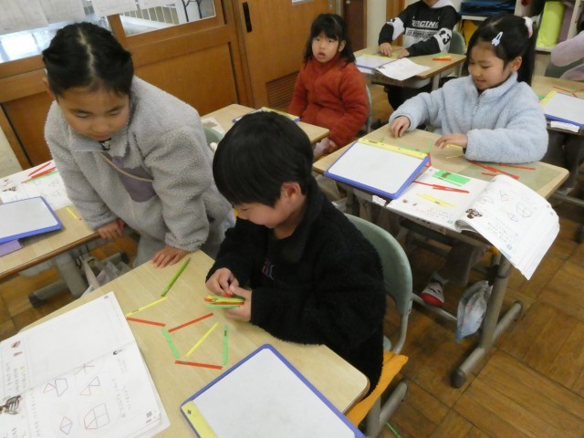 数え棒を使って形作り。教科書に出ている形と同じ形が作れるかな? 全部できたらはやく作る競争だ!
