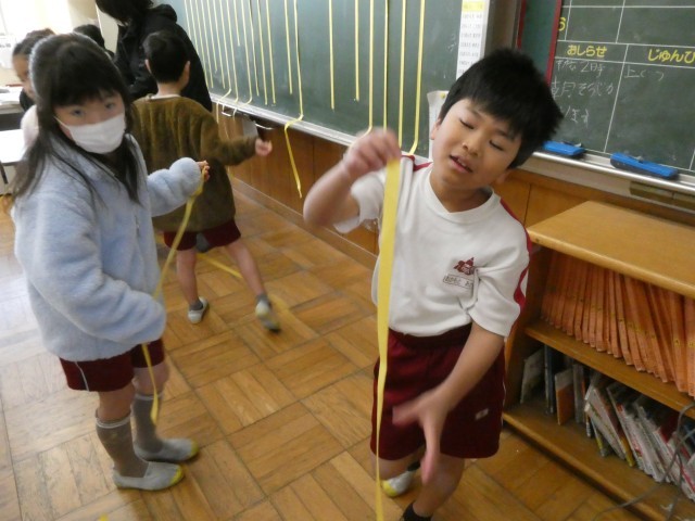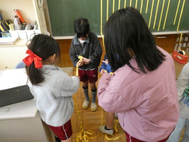 1mってどれくらい? 一人一人が「これくらいが1m」と切った紙テープを並べてみました。