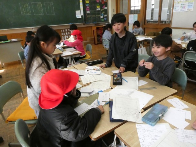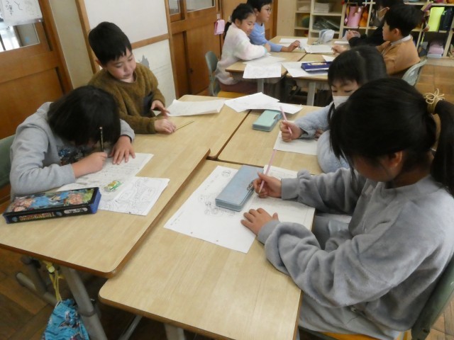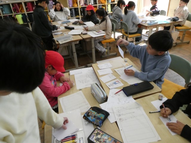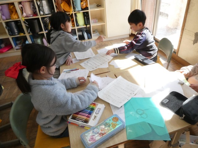 もうすぐ2年生になる1年生に、「2年生ってこんなことするんだよ」と教えてあげるカルタを作成中です。1年生がわくわくするような文を作って、楽しい絵を描いて・・・大忙しです。