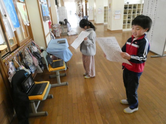 お家の仕事にチャレンジ! お家の人も自分もにこにこになれるようにがんばりました。明日の参観では、仕事の手順や気付いたこと、気を付けることなどを発表するので、練習をしていました。