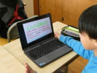 廊下に展示された図工の作品を楽しそうに見ている姿がとても微笑ましいです。