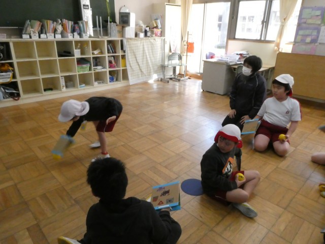 手作りラケットでテニピンの練習中です。ボールをバウンドさせるのがなかなかむずかしそうですが、粘り強く取り組んでいました。