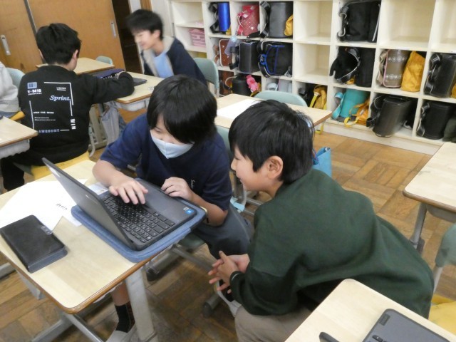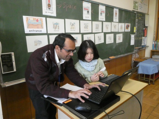 道案内できるかな? パソコンの画面には絵地図が表示されています。Go Straight.Turn left.・・・