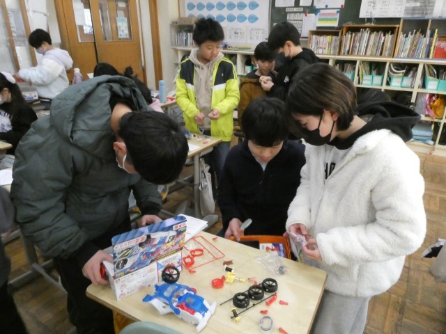 電磁石の力を確かめる実験用のモーターカーを組み立て中です。