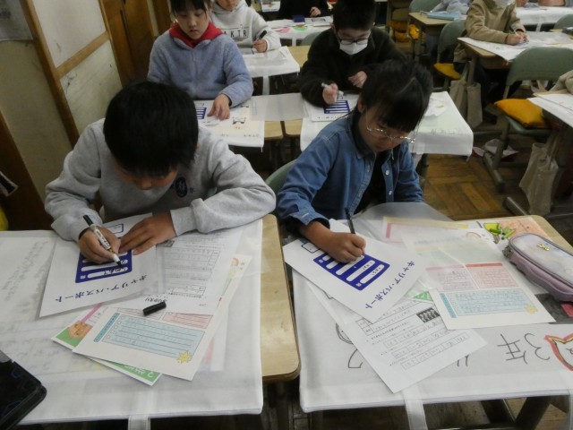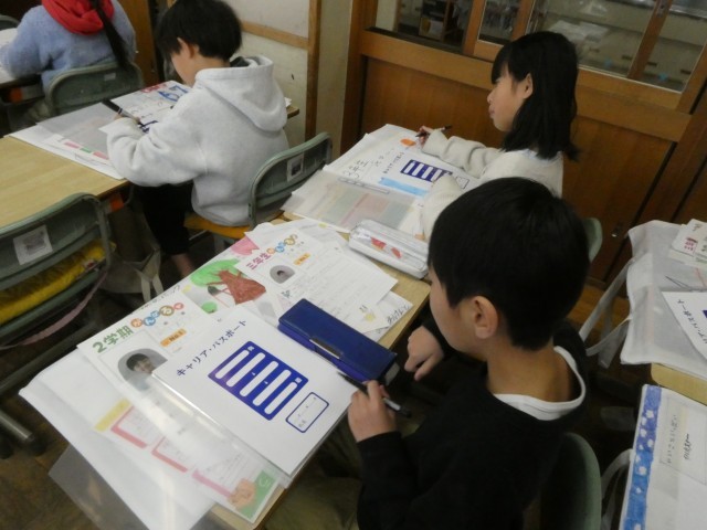 3年生で描いた絵や書写などの作品を整理して作品バッグに入れた後、キャリアパスポートに「目標とふり返り」のカードを入れました。