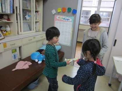 手をぶつけてしまった1年生を6年生が保健室に連れてきました。