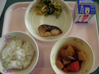 塩サバ おひたし 生揚げと野菜の煮物 ご飯 牛乳です。