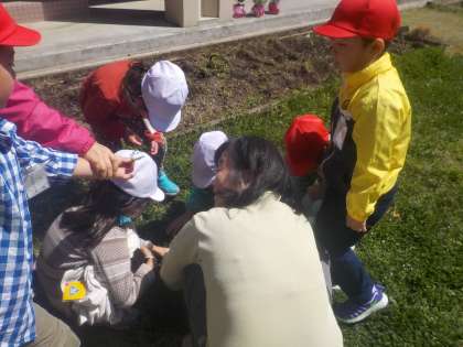 四つ葉のクローバー探しに夢中。なかなか見つからないよー。