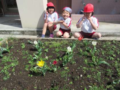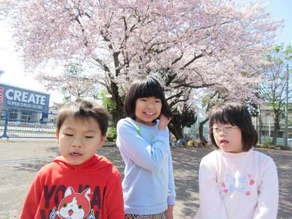 平成29年度、7組は3名のメンバーです。みんなで春を探しにグランドに出ました。チューリップや桜の前で記念撮影をしました。それぞれ1学年ずつ進級し、気持ちも新たにがんばっています。