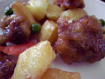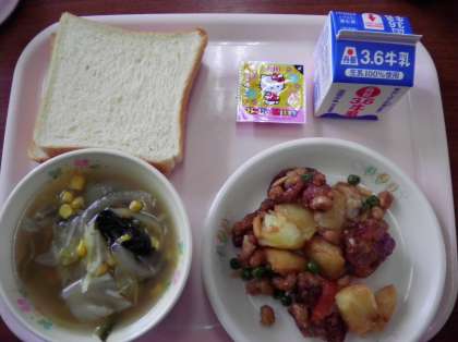 鶏肉とじゃがいもの揚げ煮 春キャベツスープ パン 牛乳 チーズ