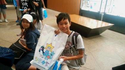 スカイツリーの土産物屋コーナーで抽選会。軒並み参加賞のステッカーの中で、当てちゃった強者も。
