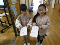 きりを使って穴をあけて、どんぐりごまを作ったり、まつぼっくりを玉に見立ててけん玉を作ったりしました。また、みんなで遊ぶのが楽しみです。
