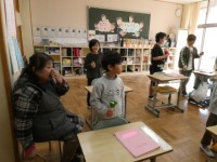 節分にちなみ、鬼のお面を作りました。一人一人退治したい心の鬼をみんなの前で発表し、豆まきをしました。その後、みんなで記念撮影をしていたところ、赤鬼さんが教室に来てみんなびっくりしました。