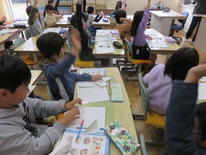 2年生の算数です。折り紙を同じ大きさに分ける方法を考えています。隣の教室は、図工です。音がなる楽器を作っています。材料を工夫して飾りもつけて楽しそうです。